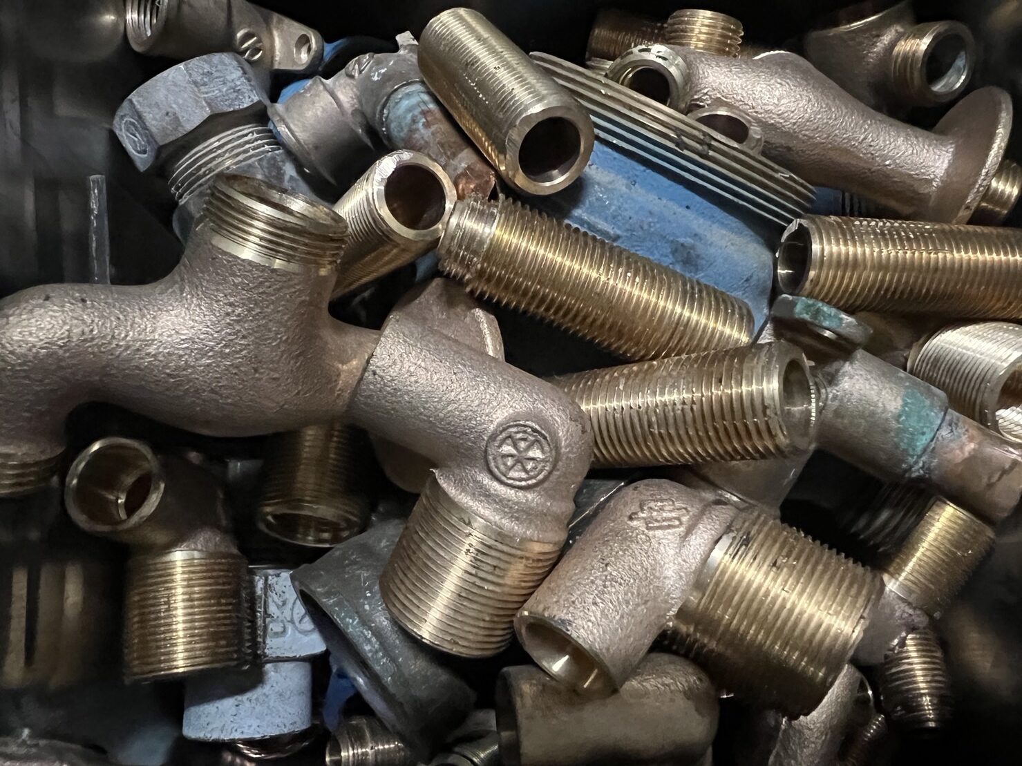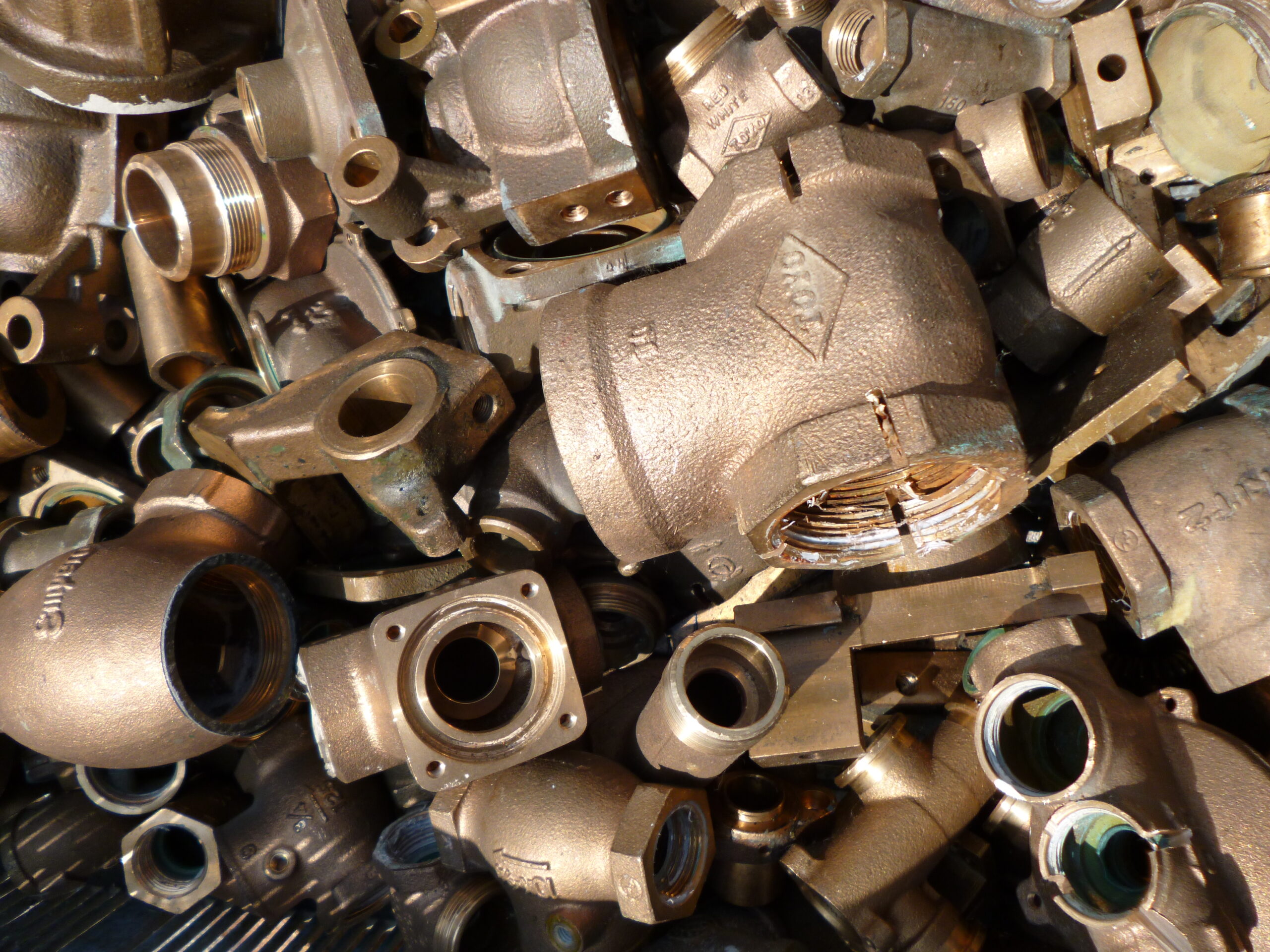 砲金のスクラップです。砲金・青銅は銅と錫(Sn)の合金です。最も古くから使用されてきた合金で5000年もの歴史があります。代表的な砲金の成分は銅85%、亜鉛、錫、鉛が5%ずつ含まれています。錫が3~9%程度のものが実用青銅として用いられ、錫の含有量によって色調が変わります。耐食性、鋳造性に優れ、現代でも水回りの水栓道具や軸受け、ブッシュ等の機械部品等に使用されています。真鍮や鉄等の金属やプラスチックが付着していますと買取価格は下落し、込砲金や込真鍮での買取となりますのでご注意ください。